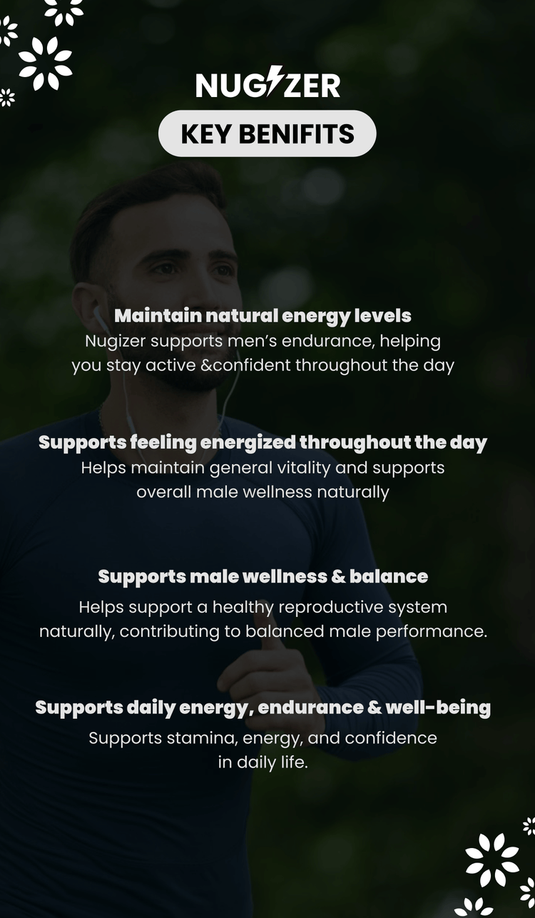 Nugizer combines clinically studied herbal extracts, amino acids, and essential micronutrients that may help support men’s vitality, stamina, and overall performance.